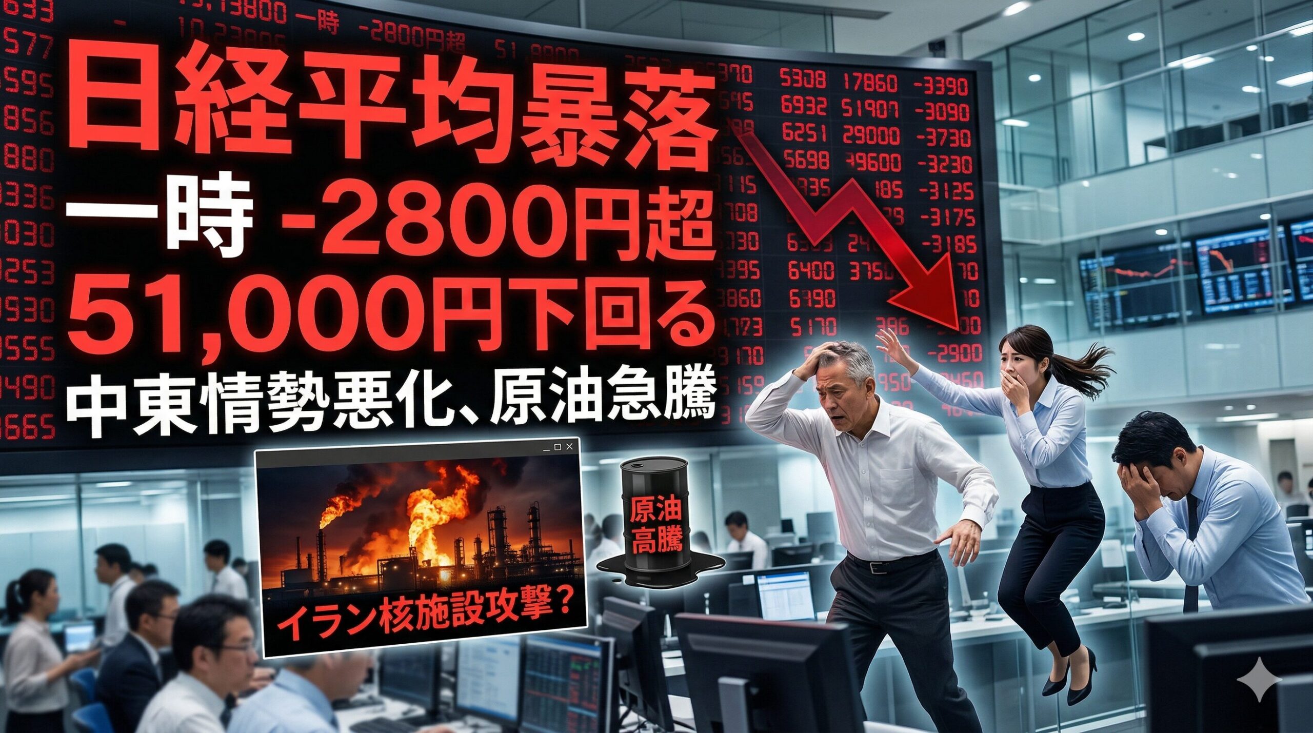 2026年3月30日午前、東京株式市場は歴史的な「暗黒の月曜日」を迎えました。日経平均株価は取引開始直後から急落し、前週末比の下げ幅は一時 2,800円 を突破。心理的節目である 51,000円 をあっさりと割り込みました。 このパニック売りの引き金となったのは、3月27日に発生した米国・イスラエル連合軍によるイランへの大規模軍事攻撃です。本記事では、この軍事衝突の真相と、世界経済を揺るがす原油高の行方、そして日本経済への影響について専門的な視点から詳しく解説します。 1. 3月27日「イラン核施設攻撃」 ...